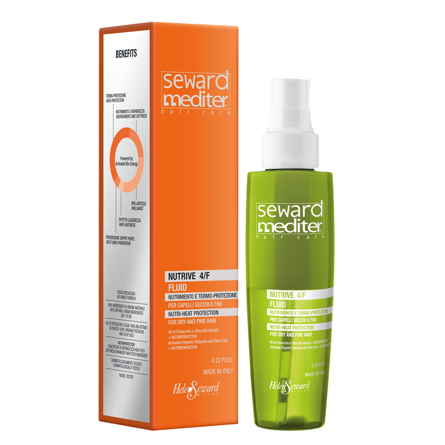 Fluido Bifase de Nutrição e Termoproteção para cabelos secos e finos, com Óleos de Pistácio e Azeitona BIO Ativados + NUTRIPERFECTOR. Ideal como pré styling, oferece uma ação eficaz protetora e iluminante. Aplicado diariamente, renova a nutrição e a suavidade.